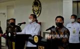 Menteri BUMN Erick Thohir (kanan) bersama Jaksa Agung ST Burhanuddin (kedua kanan) memberikan keterangan pers di Gedung Kartika Adhyaksa Kejaksaan Agung Republik Indonesia, Jakarta, Selsa (11/1). Kedatangan Menteri BUMN ke Kejaksaan Agung tersebut dalam rangka melaporkan beberapa kasus terkait maskapai Garuda Indonesia. Republika/Thoudy Badai (FOTO : Republika/Thoudy Badai)