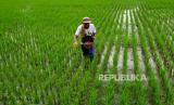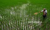 Petani menebar pupuk NPK di area persawahan Gamping , Sleman, Yogyakarta, Kamis (13/1). Menurut PT Pupuk Indonesia stok pupuk bersubsidi pada awal 2022 mencapai 1,13 juta ton. Dengan rincian pupuk Urea 512 ribu ton, NPK 305 ribu ton, SP-36 103 ribu ton, ZA 135 ribu ton, dan Organik 80 ribu ton. (FOTO : Wihdan Hidayat / Republika)