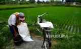 Petani menyiapkan pupuk NPK di area persawahan Gamping , Sleman, Yogyakarta, Kamis (13/1). Menurut PT Pupuk Indonesia stok pupuk bersubsidi pada awal 2022 mencapai 1,13 juta ton. Dengan rincian pupuk Urea 512 ribu ton, NPK 305 ribu ton, SP-36 103 ribu ton, ZA 135 ribu ton, dan Organik 80 ribu ton. (FOTO : Wihdan Hidayat / Republika)