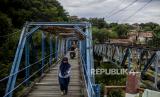 Sejumlah warga melewati Jembatan Ledeng di Kota Bogor, Jawa Barat, Kamis (10/2/2022). Jembatan peninggalan zaman Belanda tersebut merupakan akses warga yang menghubungi Kampung Sindangsari dan Kampung Mekarsari yang dipisahkan oleh Sungai Cisadane. Kondisi jembatan yang sudah usang dengan kayu yang sudah lapuk, besi yang sudah mulai berkarat dan ditumbuhi tanaman liar tersebut dapat membahayakan pengguna jembatan yang melintas. (FOTO : Republika/Putra M. Akbar)