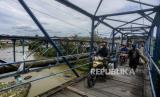 Pengendara motor melewati Jembatan Ledeng di Kota Bogor, Jawa Barat, Kamis (10/2/2022). Jembatan peninggalan zaman Belanda tersebut merupakan akses warga yang menghubungi Kampung Sindangsari dan Kampung Mekarsari yang dipisahkan oleh Sungai Cisadane. Kondisi jembatan yang sudah usang dengan kayu yang sudah lapuk, besi yang sudah mulai berkarat dan ditumbuhi tanaman liar tersebut dapat membahayakan pengguna jembatan yang melintas. Republika/Putra M. Akbar (FOTO : Republika/Putra M. Akbar)