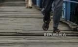Warga berjalan melewati Jembatan Ledeng di Kota Bogor, Jawa Barat, Kamis (10/2/2022). Jembatan peninggalan zaman Belanda tersebut merupakan akses warga yang menghubungi Kampung Sindangsari dan Kampung Mekarsari yang dipisahkan oleh Sungai Cisadane. Kondisi jembatan yang sudah usang dengan kayu yang sudah lapuk, besi yang sudah mulai berkarat dan ditumbuhi tanaman liar tersebut dapat membahayakan pengguna jembatan yang melintas. Republika/Putra M. Akbar (FOTO : Republika/Putra M. Akbar)