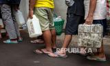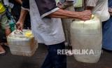 Warga antre membawa jeriken untuk membeli minyak goreng curah saat operasi minyak goreng CV Sawit Juara di sekitar Pasar Dargo, Semarang, Jawa Tengah, Senin (21/2/2022). Kementerian Perdagangan menunjuk sejumlah distributor minyak goreng untuk menjual minyak goreng curah maupun dalam kemasan dengan harga eceran tertinggi (HET) yang ditetapkan Rp12.800 per kilogram atau Rp11.500 per liter kepada masyarakat maupun pedagang dalam upaya menstabilkan harga serta memastikan ketersediaan stok minyak goreng di pasaran.  (FOTO : Antara/Aji Styawan)