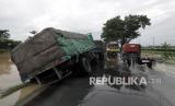 Sebuah truk terperosok saat mencoba menerobos genangan banjir di ruas jalur selatan Jawa Tengah, Desa Kedungpring, Kemranjen, Banyumas, Jawa Tengah, Selasa (15/3/2022). Banjir yang melanda jalur selatan Jawa Tengah tersebut menyebabkan kemacetan kendaraan dari arah Jogja menuju Bandung maupun sebaliknya, yang tertahan akibat tingginya genangan air sejak pukul 03.00 WIB. (FOTO : ANTARA/Idhad Zakaria)
