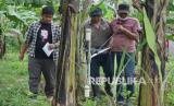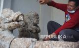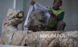 REPUBLIKA.CO.ID, TULUNGAGUNG -- Petugas mengukur panjang dimensi arca Dwarapala yang ditemukan di Desa Podorejo, Tulungagung, Jawa Timur, Sabtu (19/3/2022). Dua arca berbentuk Dwarapala dan Jaladwara atau kepala naga yang diduga peninggalan zaman Majapahit (1293 - 1527) itu ditemukan warga secara tidak sengaja di kedalaman tanah sekitar 30 centimeter saat melakukan penggalian untuk pembangunan gudang masjid setempat.