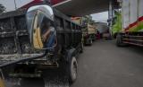 Supir truk antre saat membeli bahan bakar solar besubsidi di salah satu SPBU di Lebak, Banten, Selasa (29/3/2022). Antrean yang didominasi truk tersebut terjadi akibat langkanya bahan bakar solar bersubsidi di sejumlah SPBU di provinsi Banten (FOTO : ANTARA/Muhammad Bagus Khoirunas)