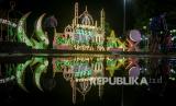 Warga berfoto dengan latar belakang instalasi lampion bertema Ramadhan di kawasan Balai Kota, Solo, Jawa Tengah, Selasa (5/4/2022). Hiasan instalasi lampu lampion tersebut untuk menyemarakan bulan Ramadhan sekaligus upaya menarik kunjungan wisata religi Kota Solo. (FOTO : Antara/Mohammad Ayudha)