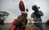 Pemudik sepeda motor dengan membawa hewan peliharaannya bersiap melanjatukan perjalanan usai berisitirahat ketika melintasi jalur pantura daerah Pamanukan, Subang, Jawa Barat, Kamis (29/4/2022).Pada H-3 Lebaran, jalur Pantura dipadati kendaraan pemudik khususnya kendaraan roda dua yang menuju wilayah Cirebon dan Jawa Tengah. (FOTO : Prayogi/Republika.)