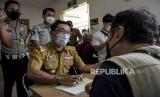 Gubernur Jawa Barat Ridwan Kamil (kiri) berbincang dengan warga yang akan membayar pajak kendaraan saat kunjungan kerja di Kantor Samsat Pajajaran, Jalan Pajajaran, Kota Bandung, Senin (9/5/2022). Kunjungan tersebut dalam rangka untuk memantau serta memastikan kinerja pelayanan publik berjalan dengan baik pada hari pertama kerja pasca cuti bersama Lebaran 2022. Foto: Republika/Abdan Syakura (FOTO : REPUBLIKA/ABDAN SYAKURA)