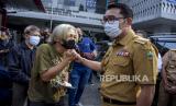 Gubernur Jawa Barat Ridwan Kamil (kanan) menyapa warga yang akan membayar pajak kendaraan saat kunjungan kerja di Kantor Samsat Pajajaran, Jalan Pajajaran, Kota Bandung, Senin (9/5/2022). Kunjungan tersebut dalam rangka untuk memantau serta memastikan kinerja pelayanan publik berjalan dengan baik pada hari pertama kerja pasca cuti bersama Lebaran 2022. Foto: Republika/Abdan Syakura (FOTO : REPUBLIKA/ABDAN SYAKURA)