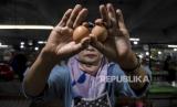 Pedagang menunjukkan telur di kiosnya di Pasar Kosambi, Kota Bandung, Rabu (11/5/2022). Berdasarkan keterangan pedagang, sepekan pasca Lebaran harga bahan pokok di pasar tersebut stabil diantaranya harga daging sapi tetap di Rp150 ribu, harga daging ayam turun dari Rp45 ribu menjadi Rp42 ribu per kilogram, telur ayam dari Rp30 ribu menjadi Rp28 ribu per kilogram, harga cabai rawit dari Rp100 ribu menjadi Rp50 ribu dan harga cabai merah keriting dari Rp60 ribu menjadi Rp40 ribu. Foto: Republika/Abdan Syakura (FOTO : REPUBLIKA/ABDAN SYAKURA)