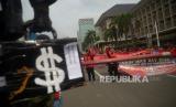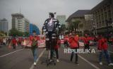 Massa yang tergabung Gerakan Buruh Bersama Rakyat (Gebrak) berunjuk rasa di kawasan  Patung Kuda, Jakarta, Sabtu (21/5/2022). Aksi yang bertepatan dengan peringatan 24 tahun reformasi tersebut membawa 14 tuntutan, yaitu pencabutan Omnibus Law Cipta Kerja, penolakan revisi UU PPP, diturunkannya harga minyak goreng dan tolak penundaan Pemilu. (FOTO : Prayogi/Republika.)