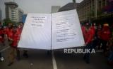 REPUBLIKA.CO.ID, JAKARTA -- Massa yang tergabung Gerakan Buruh Bersama Rakyat (Gebrak) berunjuk rasa di kawasan Patung Kuda, Jakarta, Sabtu (21/5/2022). Aksi yang bertepatan dengan peringatan 24 tahun reformasi tersebut membawa 14 tuntutan, yaitu pencabutan Omnibus Law Cipta Kerja, penolakan revisi UU PPP, diturunkannya harga minyak goreng dan tolak penundaan Pemilu.