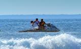 Peselancar Indonesia Rio Waida (kiri) naik jetski usai pertandingan di Pantai Plengkung (G-Land), TN Alas Purwo, Banyuwangi, Jawa Timur, Sabtu (28/5/2022).Pada hari pertama kompetisi selancar paling bergengsi di dunia, World Surf League (WSL) 2022 G-Land, peselancar Indonesia Rio Waida berhasil mengalahkan peringkat satu dunia Filipe Toledo asal Brazil dan berhak melangkah ke babak 16 besar. (FOTO : ANTARA/Budi Candra Setya)