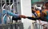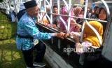 Pengantar menyalami jamaah calon haji di halaman Asrama Haji Donohudan, Boyolali, Jawa Tengah, Jumat (3/6/2022). Kerabat dan tetangga satu domisili jemaah calon haji ikut mengantarkan hingga Asrama Haji Donohudan. Kebiasaan ini masih dilakukan oleh sebagian warga setiap musim keberangkatan haji. (FOTO : Wihdan Hidayat / Republika)