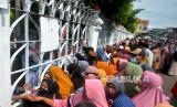 Pengantar jamaah calon haji memadati halaman Asrama Haji Donohudan, Boyolali, Jawa Tengah, Jumat (3/6/2022). Kerabat dan tetangga satu domisili jemaah calon haji ikut mengantarkan hingga Asrama Haji Donohudan. Kebiasaan ini masih dilakukan oleh sebagian warga setiap musim keberangkatan haji. (FOTO : Republika / Wihdan Hidayat)
