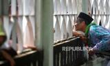 Jamaah calon haji menemui pengantar di halaman Asrama Haji Donohudan, Boyolali, Jawa Tengah, Jumat (3/6/2022). Kerabat dan tetangga satu domisili jemaah calon haji ikut mengantarkan hingga Asrama Haji Donohudan. Kebiasaan ini masih dilakukan oleh sebagian warga setiap musim keberangkatan haji. (FOTO : Wihdan Hidayat / Republika)