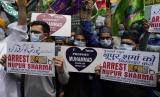 Muslim India memegang plakat menuntut penangkapan Nupur Sharma, juru bicara partai nasionalis Hindu yang memerintah saat mereka bereaksi terhadap referensi menghina Islam dan Nabi Muhammad yang dibuat olehnya selama protes di Mumbai, India, Senin, 6 Juni 2022. Di sedikitnya lima negara Arab telah mengajukan protes resmi terhadap India, dan Pakistan dan Afghanistan juga bereaksi keras pada Senin atas komentar yang dibuat oleh dua juru bicara terkemuka dari Partai Bharatiya Janata pimpinan Perdana Menteri Narendra Modi. (FOTO : AP/Rafiq Maqbool)