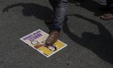 Seorang Muslim India menginjak foto Nupur Sharma, juru bicara partai nasionalis Hindu saat mereka bereaksi terhadap referensi menghina Islam dan Nabi Muhammad yang dibuat olehnya selama protes di Mumbai, India, Senin, 6 Juni 2022. Di sedikitnya lima negara Arab telah mengajukan protes resmi terhadap India, dan Pakistan dan Afghanistan juga bereaksi keras pada Senin atas komentar yang dibuat oleh dua juru bicara terkemuka dari Partai Bharatiya Janata pimpinan Perdana Menteri Narendra Modi. (FOTO : AP/Rafiq Maqbool)
