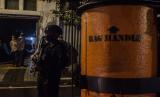 Anggota Tim Gegana Brimob Polda Jabar berjaga saat pemeriksaan temuan bahan peledak di sebuah rumah kawasan Jalan Asia Afrika, Bandung, Jawa Barat, Senin (6/6/2022). Tim Gegana Brimob Polda Jabar mengamankan sejumlah peluru, senjata api, dan bahan peledak TNT dari sebuah rumah yang akan direnovasi untuk proses penyelidikan lebih lanjut. (FOTO : ANTARA/Novrian Arbi)
