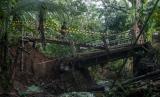 REPUBLIKA.CO.ID,LEBAK -- Warga melintasi jembatan darurat di Desa Mekarjaya, Lebak, Banten, Jumat (10/6/2022).