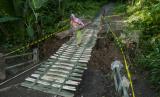 Anak bermain sepeda melintasi jembatan darurat di Desa Mekarjaya, Lebak, Banten, Jumat (10/6/2022). Hujan deras yang terus mengguyur kawasan tersebut mengakibatkan longsor sehingga mengganggu akses jalan alternatif Kabupaten Lebak-Pandeglang dan dikhawatirkan terjadi longsor susulan karena belum adanya pemasangan turap. (FOTO : ANTARA/Muhammad Bagus Khoirunas)
