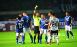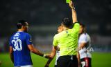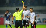 Wasit Fariq Hitaba memberikan kartu kuning kepada Striker Persib Bandung Ezra Walian dan gelandang Bali United Hariyono pada laga penyisihan Grup C Piala Presiden antara Persib Bandung melawan Bali United di Stadion GBLA, Bandung, Ahad (12/6/2022). Laga berakhir imbang dengan skor 1-1. (FOTO : Republika/Yogi Ardhi)