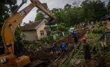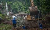 REPUBLIKA.CO.ID, LEBAK -- Petugas menggunakan alat berat membangun pondasi jalan darurat di Desa Cilangkap, Lebak, Banten, Senin (13/6/2022). Perbaikan ruas jalan penghubung antardesa yang amblas akibat bencana pergerakan tanah sepanjang 60 meter tersebut guna memberikan akses kelancaran bagi warga yang melintas.