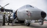 Pilot uji Kapten Esther Gayatri menuruni pesawat CN235-220 Maritime Patrol Aircraft (MPA) Full Mission di Hanggar Aircraft Services PTDI KP II, Jalan Pajajaran, Kota Bandung, Rabu (15/6/2022). Kementerian Pertahanan RI meminta PT Dirgantara Indonesia untuk meningkatkan produksi pesawat terbang yang diharapkan dapat memproduksi sedikitnya 20 pesawat terbang CN235 serta prototipe pesawat tempur dalam lima tahun ke depan guna penguatan alutsista militer Indonesia. Foto: Republika/Abdan Syakura (FOTO : REPUBLIKA/ABDAN SYAKURA)