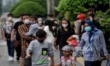 Warga menggendong anaknya berjalan di kawasan Thamrin, Jakarta, Rabu (15/6/2022). Seiring dengan meningkatnya kasus harian Covid-19 yang disebabkan adanya varian baru BA4 dan BA5, Presiden Joko Widodo mengimbau masyarakat untuk tetap waspada meski angka rerata positif kasus Covid di Indonesia masih berada di angka 1,36 persen atau dibawah standar WHO yakni 5 persen.  (FOTO : Republika/Thoudy Badai)