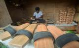 Perajin membuat tangkelek, sandal kayu tradisional Minang, di Parik Putuih, Nagari Ampang Gadang, Kabupaten Agam, Sumatera Barat, Sabtu (18/6/2022). Perajin mengaku masih banyak menerima pesanan sandal tangkelek yang dijualnya Rp8000 sepasang itu, namun kini sudah tidak ada lagi generasi penerus yang melanjutkan pekerjaan tersebut karena kurangnya minat. (FOTO : ANTARA/Iggoy el Fitra)