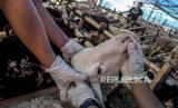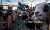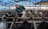 Dokter hewan dari Dinas Ketahanan Pangan dan Pertanian (DKPP) Kota Bandung memeriksa gigi seekor kambing yang dijual di salah satu tempat penjualan hewan kurban di Jalan Soekarno Hatta, Cipamokolan, Kota Bandung, Jumat (24/6/2022). Pemeriksaan tersebut untuk memastikan seluruh hewan kurban yang dijual oleh pedagang terbebas dari penyakit mulut dan kuku (PMK) dan layak dikonsumsi oleh masyarakat. Foto: Republika/Abdan Syakura (FOTO : REPUBLIKA/ABDAN SYAKURA)