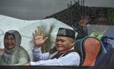 REPUBLIKA.CO.ID, PANGANDARAN -- Jamaah calon haji melambaikan tangan saat pelepasan dan pemberangkatan jamaah haji kloter pertama di Bumi Perkemahan, Kabupaten Pangandaran, Jawa Barat, Ahad (26/6/2022).