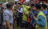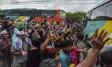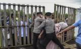 Kerabat jamaah calon haji memaksa menerobos gerbang saat pelepasan dan pemberangkatan jemaah haji kloter pertama di Bumi Perkemahan, Kabupaten Pangandaran, Jawa Barat, Ahad (26/6/2022). Sebanyak 182 orang jemaah calon haji dari Pangandaran diberangkatkan menuju Asrama Haji Embarkasi Bekasi dan rencananya diterbangkan ke Tanah Suci pada 28 Juni 2022 menuju Arab Saudi. (FOTO : ANTARA/Adeng Bustomi)
