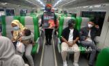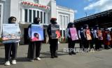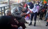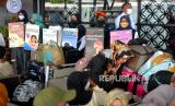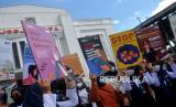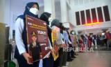 Petugas PT KAI Daop VI Yogyakarta melakukan kampanye cegah kekerasan dan pelecehan seksual di Stasiun Yogyakarta, Rabu (28/6/2022). Kampanye ini dilakukan serentak di daerah operasi PT KAI seluruh Indonesia. Tujuan dari kampanye ini adalah untuk menggugah kesadaran masyarakat agar tidak melakukan tindak kekerasan dan pelecehan seksual di transportasi umum, khususnya kereta api. (FOTO : Wihdan Hidayat / Republika)
