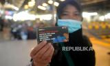 Penumpang menunjukkan stiker dari petugas PT KAI Daop VI Yogyakarta saat kampanye cegah kekerasan dan pelecehan seksual di Stasiun Yogyakarta, Rabu (28/6/2022). Kampanye ini dilakukan serentak di daerah operasi PT KAI seluruh Indonesia. Tujuan dari kampanye ini adalah untuk menggugah kesadaran masyarakat agar tidak melakukan tindak kekerasan dan pelecehan seksual di transportasi umum, khususnya kereta api. (FOTO : Wihdan Hidayat / Republika)