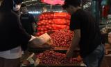 Pedagang bawang merah melayani pembeli di Pasar Induk Kramat Jati, Jakarta, Senin (4/7/2022). Sejumlah pedagang mengeluhkan sepinya pembeli akibat kenaikan bahan pangan dalam sepekan terakhir seperti cabai merah keriting dari Rp75 ribu menjadi Rp85 ribu per kilogram, cabai rawit merah dari Rp80 ribu menjadi Rp95 ribu per kilogram, bawang merah dari Rp35 ribu menjadi Rp55 ribu per kilogram, bawang putih dari Rp12 ribu menjadi Rp20 ribu per kilogram yang dipicu minimnya pasokan dari distributor dan menjelang hari raya Idul Adha. (FOTO : ANTARA/Budi Prasetiyo)