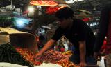 Pedagang memilah cabai rawit merah di Pasar Induk Kramat Jati, Jakarta, Senin (4/7/2022). Sejumlah pedagang mengeluhkan sepinya pembeli akibat kenaikan bahan pangan dalam sepekan terakhir seperti cabai merah keriting dari Rp75 ribu menjadi Rp85 ribu per kilogram, cabai rawit merah dari Rp80 ribu menjadi Rp95 ribu per kilogram, bawang merah dari Rp35 ribu menjadi Rp55 ribu per kilogram, bawang putih dari Rp12 ribu menjadi Rp20 ribu per kilogram yang dipicu minimnya pasokan dari distributor dan menjelang hari raya Idul Adha. (FOTO : ANTARA/Budi Prasetiyo)