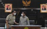 Menteri Pertanian Syahrul Yasin Limpo (kanan) berbincang dengan Gubernur DKI Jakarta Anies Baswedan (kiri) sebelum penandatanganan nota kesepakatan dan peluncuran dukungan Kementerian Pertanian dalam penyediaan ternak kurban dan pangan strategis bagi wilayah DKI Jakarta di Gedung Kementan, Jakarta, Senin (4/7/2022). Kementerian Pertanian mendukung kesiapan Idul Adha di wilayah DKI Jakarta dengan menyediakan ribuan hewan ternak dan kebutuhan pangan lainnya seperti komoditas bawang, minyak goreng, beras, dan aneka jenis cabai. (FOTO : ANTARA/Indrianto Eko Suwarso)