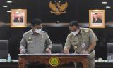 Menteri Pertanian Syahrul Yasin Limpo (kanan) bersama Gubernur DKI Jakarta Anies Baswedan (kiri) menandatangani nota kesepakatan dan peluncuran dukungan Kementerian Pertanian dalam penyediaan ternak kurban dan pangan strategis bagi wilayah DKI Jakarta di Gedung Kementan, Jakarta, Senin (4/7/2022). Kementerian Pertanian mendukung kesiapan Idul Adha di wilayah DKI Jakarta dengan menyediakan ribuan hewan ternak dan kebutuhan pangan lainnya seperti komoditas bawang, minyak goreng, beras, dan aneka jenis cabai. (FOTO : ANTARA/Indrianto Eko Suwarso)