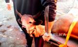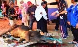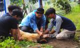 Jamaah Masjid Al Furqon Bandung menyembelih hewan qurban usai menunaikan Sholat Idul Adha di lingkungan masjid, Ahad (10/7/2022). Tahun ini warga menyembelih 13 ekor sapi dan 14 ekor kambing yang didistribusikan ke sekitar wilayah perumahan warga. (FOTO : Republika/Yogi Ardhi)