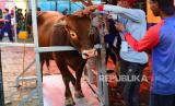 REPUBLIKA.CO.ID, BANDUNG -- Pengurus Masjid Al Furqon Bandung kembali menyembelih sejumlah hewan qurban di lingkungan masjid, Ahad (10/7/2022). Masjid ini memiliki mesin perebah sapi untuk merebahkan sapi tanpa harus dibanting.
