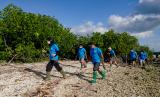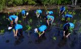 Sejumlah karyawan Traveloka melakukan penanaman bibit bakau di Hutan Mangrove, Kecamatan Gerokgak, Buleleng, Bali, Selasa (26/7/2022). Penanaman ini sebagai bagian dari komitmen Traveloka mengurangi emisi CO2, mendorong pelestarian ekowisata dan pengembangan pariwisata berkelanjutan. (FOTO : Dok Traveloka)