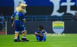 Karakter harimau maskot Persib Bandung, Prabu, menghibur pemain muda Persib usai laga Liga Indonesia antara Persib Bandung melawan Madura United di Stadion GBLA, Bandung, Sabtu (30/7/2022). Laga berakhir dengan skor 3-1 bagi kemenangan tim tamu. (FOTO : Republika/Yogi Ardhi)