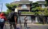 Jurnalis melakukan siaran di depan kediaman istri mantan Kadiv Propam Polri Irjen Ferdy Sambo, Putri Candrawathi di Jalan Saguling III, Kompleks Pertambangan, Duren Tiga, Jakarta Selatan, Selasa (9/8/2022). Kunjungan LPSK tersebut dalam rangka pemeriksaan atau asesmen psikologis terhadap Putri yang sebelumnya mengajukan permohonan perlindungan kepada LPSK sebagai korban dugaan pelecehan dalam kasus kematian Brigadir J. Republika/Thoudy Badai (FOTO : Republika/Thoudy Badai)