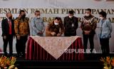 Ketua KPK, Firli Bahuri (tengah) menandatangani prasasti disaksikan  Hakim Agung Mahkamah Agung, Surya Jaya (kiri), Anggota I BPK Nyoman Adhi Suryadnyana (kedua kiri), Wakil Ketua Alexander Marwata (ketiga kiri), Nawawi Pomolango (ketiga kanan), Wakil Ketua Komisi III DPR Ahmad Sahroni (kedua kanan) dan anggota Dewan Pengawas KPK, Albertina Ho (kanan) saat meresmikan Rumah Penyimpanan Benda Sitaan dan Barang Rampasan (Rupbasan) KPK di Jalan Dewi Sartika, Cawang, Jakarta Timur, Rabu (10/8/2022). Rupbasan tersebut dimanfaatkan sebagai optimalisasi asset recovery melalui pemeliharaan, pengamanan benda sitaan, ataupun barang rampasan dari penanganan tindak pidana korupsi yang ditangani KPK. Republika/Thoudy Badai (FOTO : Republika/Thoudy Badai)