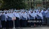 Pelajar mengikuti upacara HUT ke-77 RI di kawasan Masjid Istiqlal, Jakarta, Rabu (17/8/2022). Masjid Istiqlal pertama kali menggelar upacara lintas agama dalam memperingati HUT ke-77 RI dengan harapan menjadi momentum persatuan antar umat beragama. Upacara tersebut diikuti juga oleh pelajar dari Madrasah dan pengelola Istiqlal. (FOTO : Republika/Thoudy Badai)
