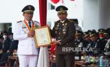 Gubernur Jawa Barat Ridwan Kamil menyerahkan penghargaan kepada Kepala Kejaksaan Tinggi Jawa Barat Asep N Mulyana atas terselenggaranya Kurikulum Pendidikan Anti Korupsi untuk jenjang SMA/SMK/SLB di Jawa Barat saat Upacara Pengibaran Merah Putih dalam rangka peringatan HUT ke-77 Kemerdekaan RI tingkat Provinsi Jawa Barat di Lapangan Gasibu, Kota Bandung, Rabu (17/8). Kegiatan ini menjadi yang pertama diselenggarakan secara terbuka di Gasibu setelah dua tahun dilaksanakan secara terbatas di halaman Gedung Sate karena pandemi Covid-19. (FOTO : Edi Yusuf/Republika)