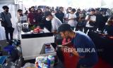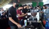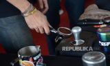 Para barista peserta kompetisi seni melukis di atas kopi sedang meracik kopi untuk dinilai para juri saat Bedas Coffee Festival dan Job Fair di Dome Bale Rame, Soreang Kabupaten Bandung, Rabu (24/8). Kegiatan yang digelar Pemkab Bandung ini menampilkan berbagai produk unggulan di Kabupaten Bandung, khususnya kopi. Pelaksanaan Bedas Coffee Festival ini diikuti 50 stand kopi, 10 bazzar dan menyiapkan 2500 cup kopi gratis untuk pengunjung. (FOTO : Edi Yusuf/Republika)