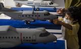 REPUBLIKA.CO.ID, BANDUNG -- Seorang anak melihat replika pesawat produksi PT Dirgantara Indonesia (PTDI) yang dipamerkan pada HUT ke-46 PTDI di Landasan Hanggar PTDI, Bandung, Jawa Barat, Sabtu (27/8/2022).